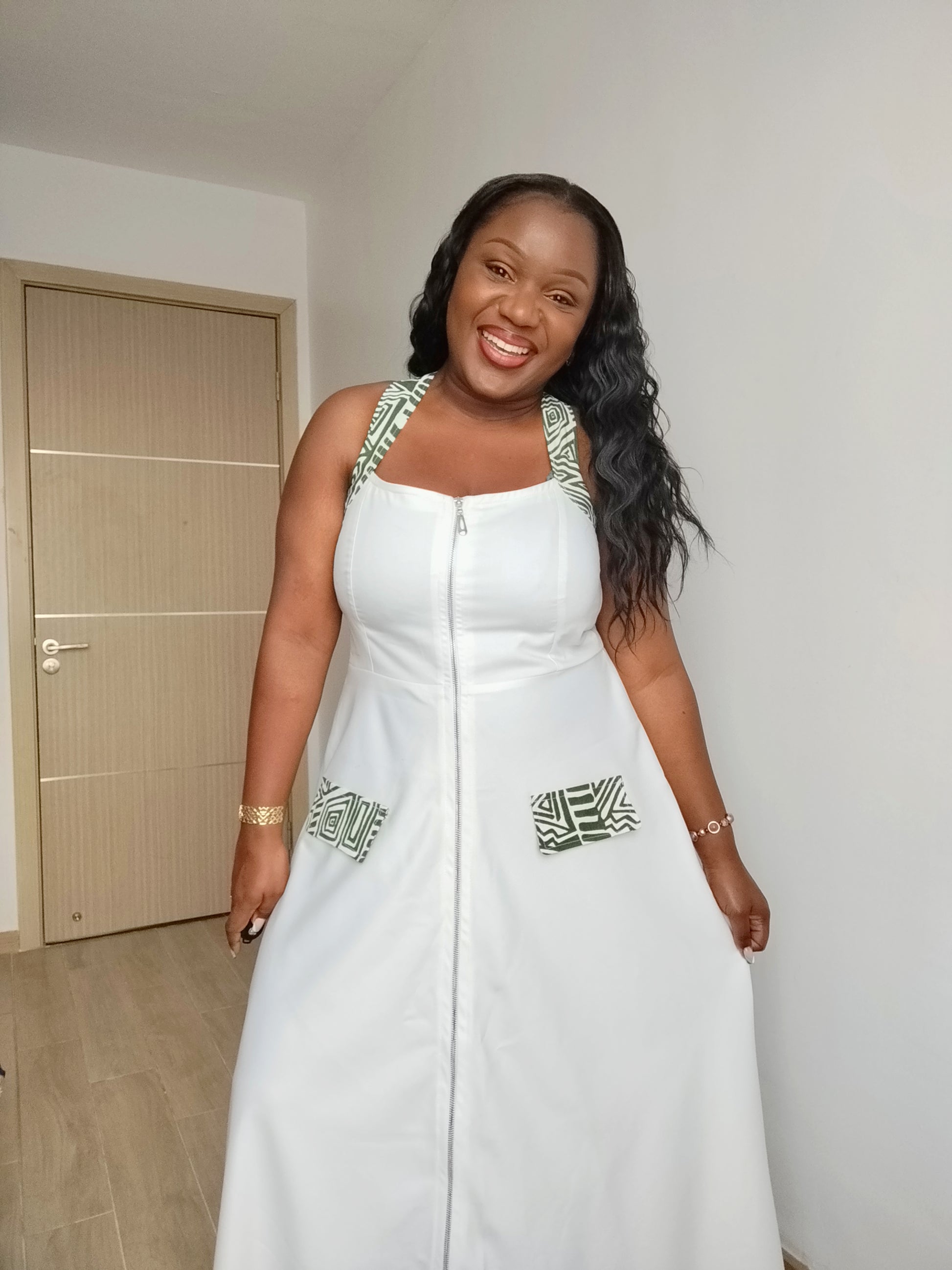 The Kimia Dress which is named after the Swahili word for quiet — is a serene statement of style. Made from premium off-white twill cotton, it offers a structured yet comfortable fit, perfect for warm-weather elegance. A sleek front zipper adds modern versatility, while the sleeves, crafted from a vibrant green ethnic-patterned fabric, break the monotony with a bold cultural touch. Whether paired with sandals for a casual day out or dressed up with heels for a gathering, Kimia is a piece that whispers sophistication while speaking volumes about your unique style.